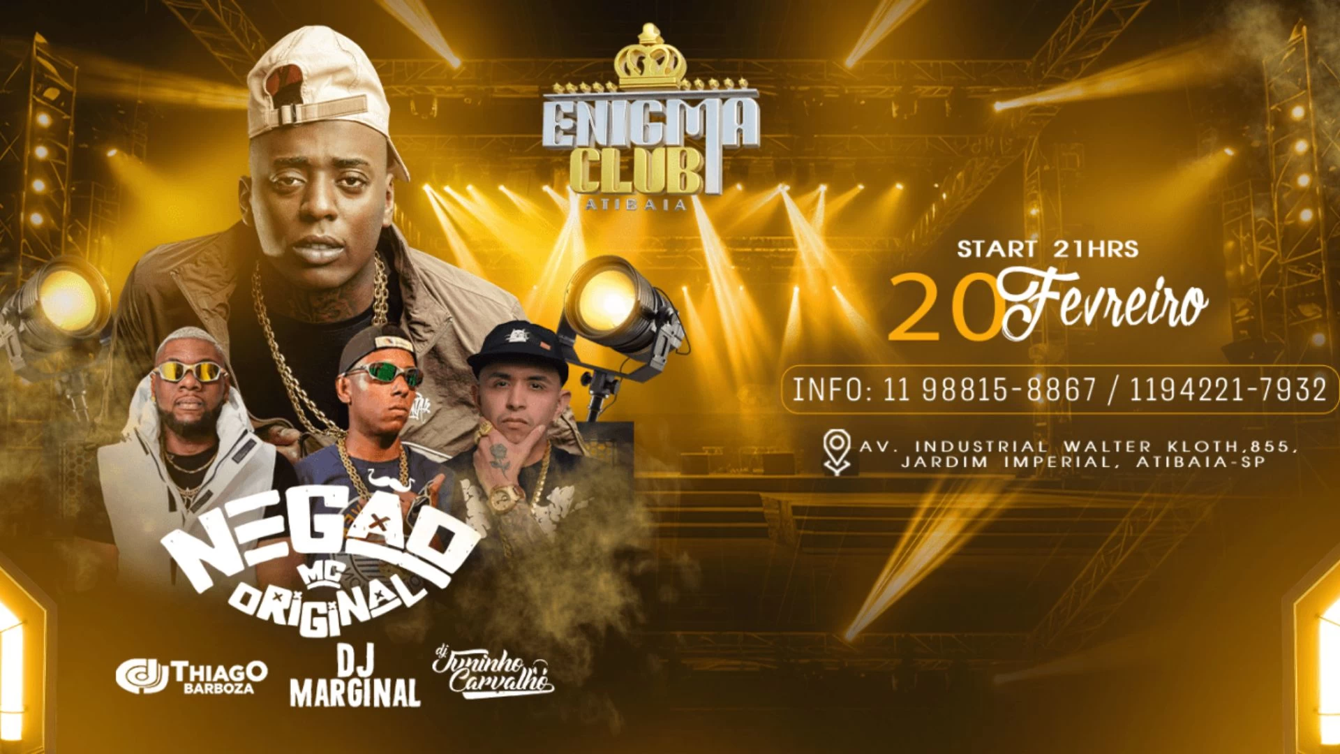 No dia 20 de fevereiro, o Baile do Enigma chega com uma edição PESADA com MC NEGÃO ORIGINAL, trazendo o grave no talo, a pista fervendo e aquela experiência única que só o Enigma Club entrega.